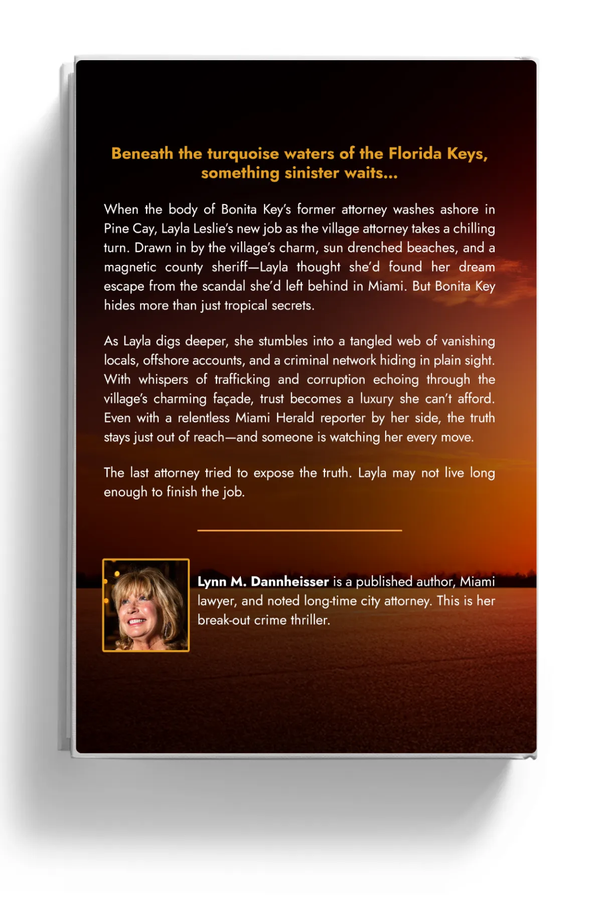 When the body of Bonita Key’s former attorney washes ashore in Pine Cay, Layla Leslie’s new job as the village attorney takes a chilling turn. Drawn in by the village’s charm, sun-drenched beaches, and a magnetic county sheriff, Layla thought she’d found her dream escape from the scandal she’d left behind in Miami. But Bonita Key hides more than just tropical secrets.